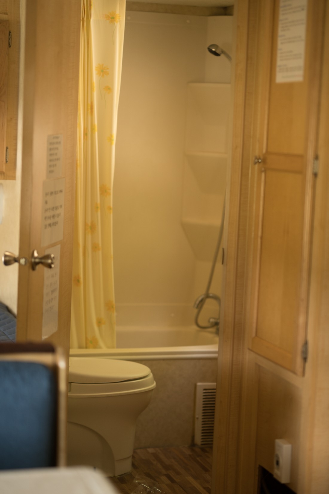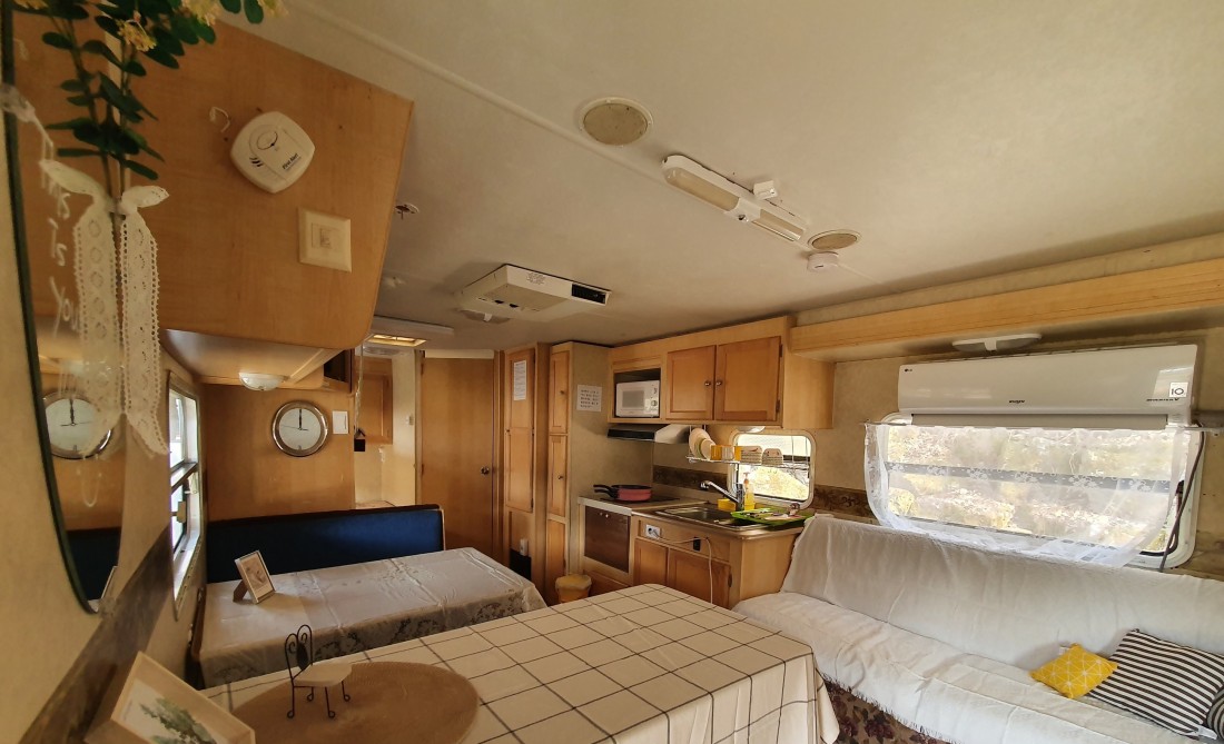 카라반 실내 구성 : 2인침대한개와,1인침대 두개,식탁 테이블,버너,식기도구,실내화,냉장고,에어컨,선풍기,전기시설,휴지,수건,치약,칫솔,비누