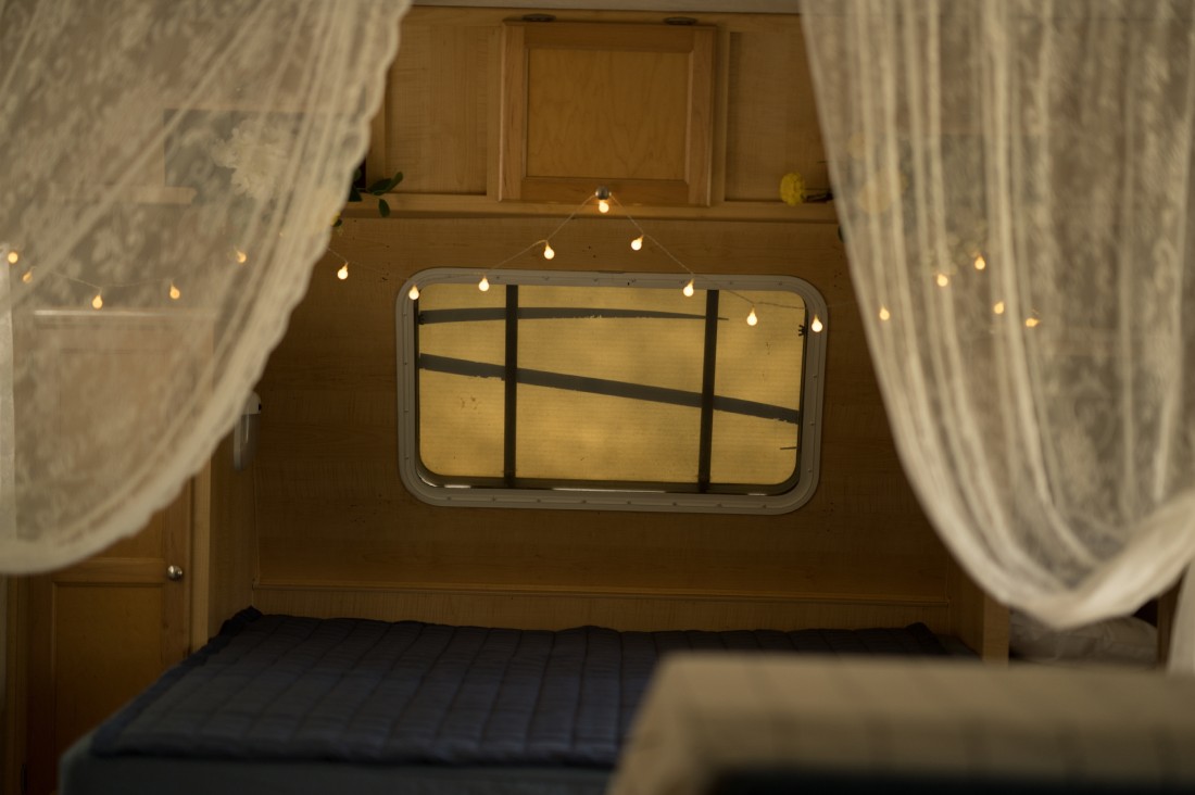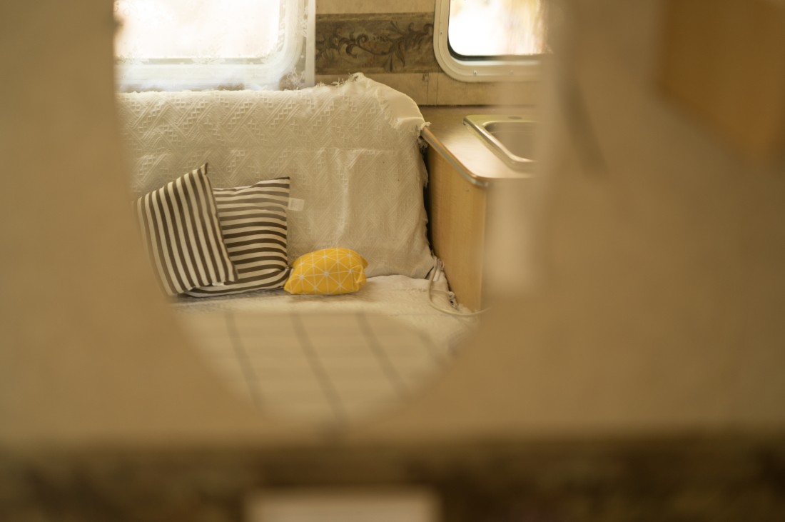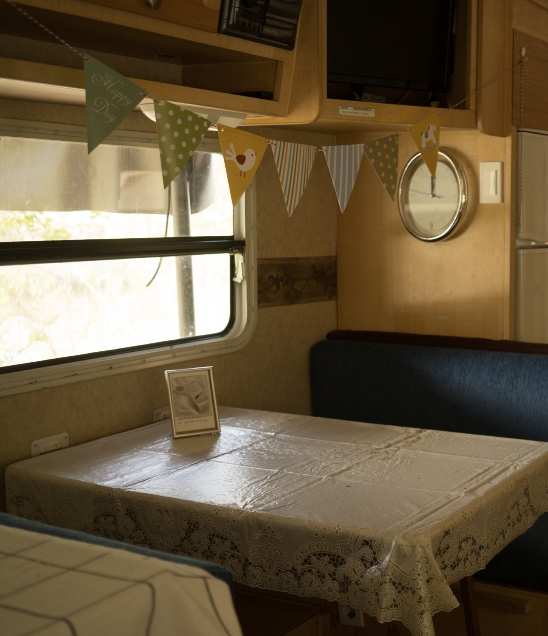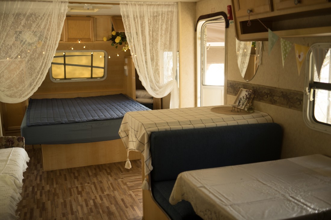 카라반 실내 구성 : 2인침대한개와,1인침대 두개,식탁 테이블,버너,식기도구,실내화,냉장고,에어컨,선풍기,전기시설,휴지,수건,치약,칫솔,비누